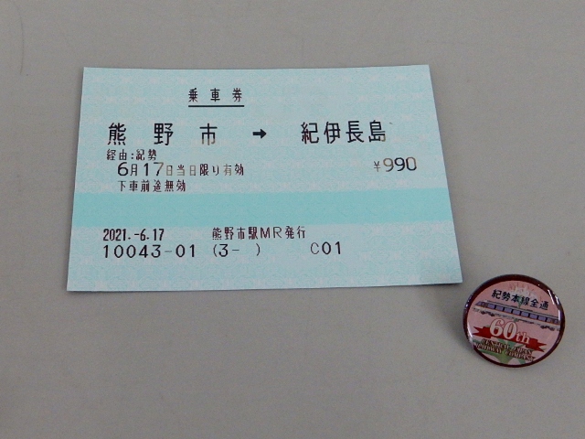 を不憫に思ったのか、非売品のバッジ(紀勢線全通60周年)を頂き