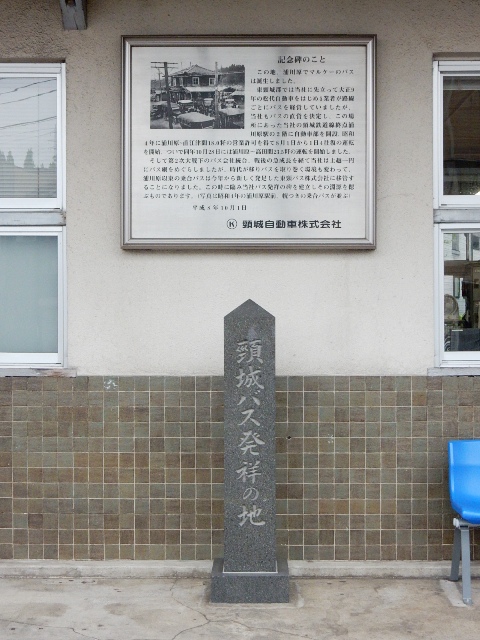 高架線で、建物前に「頸城バス発祥の地」と言う石碑がありました。
