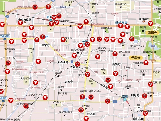 左が奈良市中心部における d Wi-Fiのスポットです。コレなら安心?