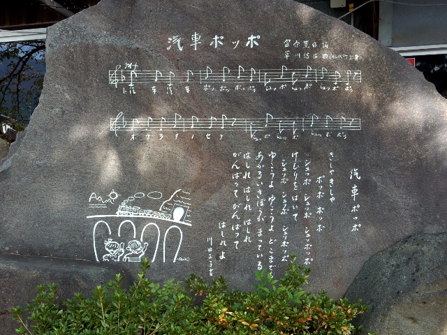 旧松代駅の駅前に童謡「汽車ポッポ」の歌碑と説明書きがありました。