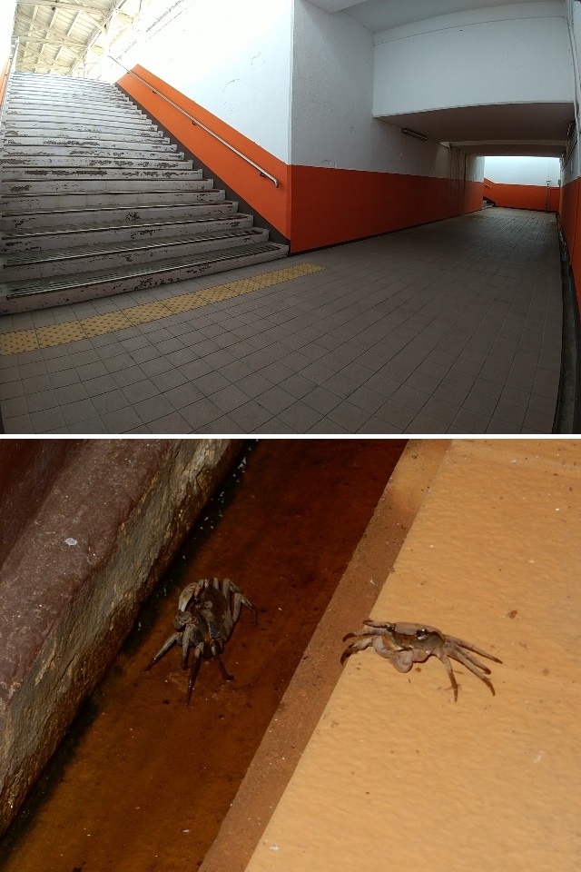 海に近い所だからか、地下通路の排水溝にサワガニ?が居ました。