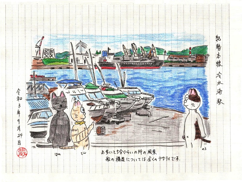 この日は紀勢本線の冷水浦と南海電鉄の加太(かだ)の2駅を描く