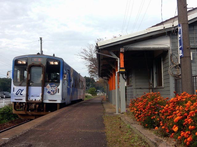 秋に来たのは初めてなので、駅前やホームの花壇にマリーゴールド